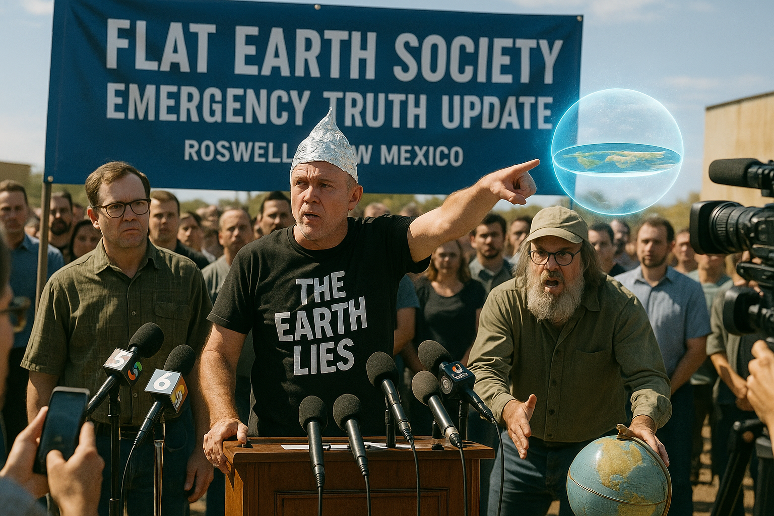 In a shocking press release delivered from the edge of a folding table, the Flat Earth Society has finally conceded that the Earth is, in fact, round — but only because it’s trying to “look normal to avoid suspicion.”
